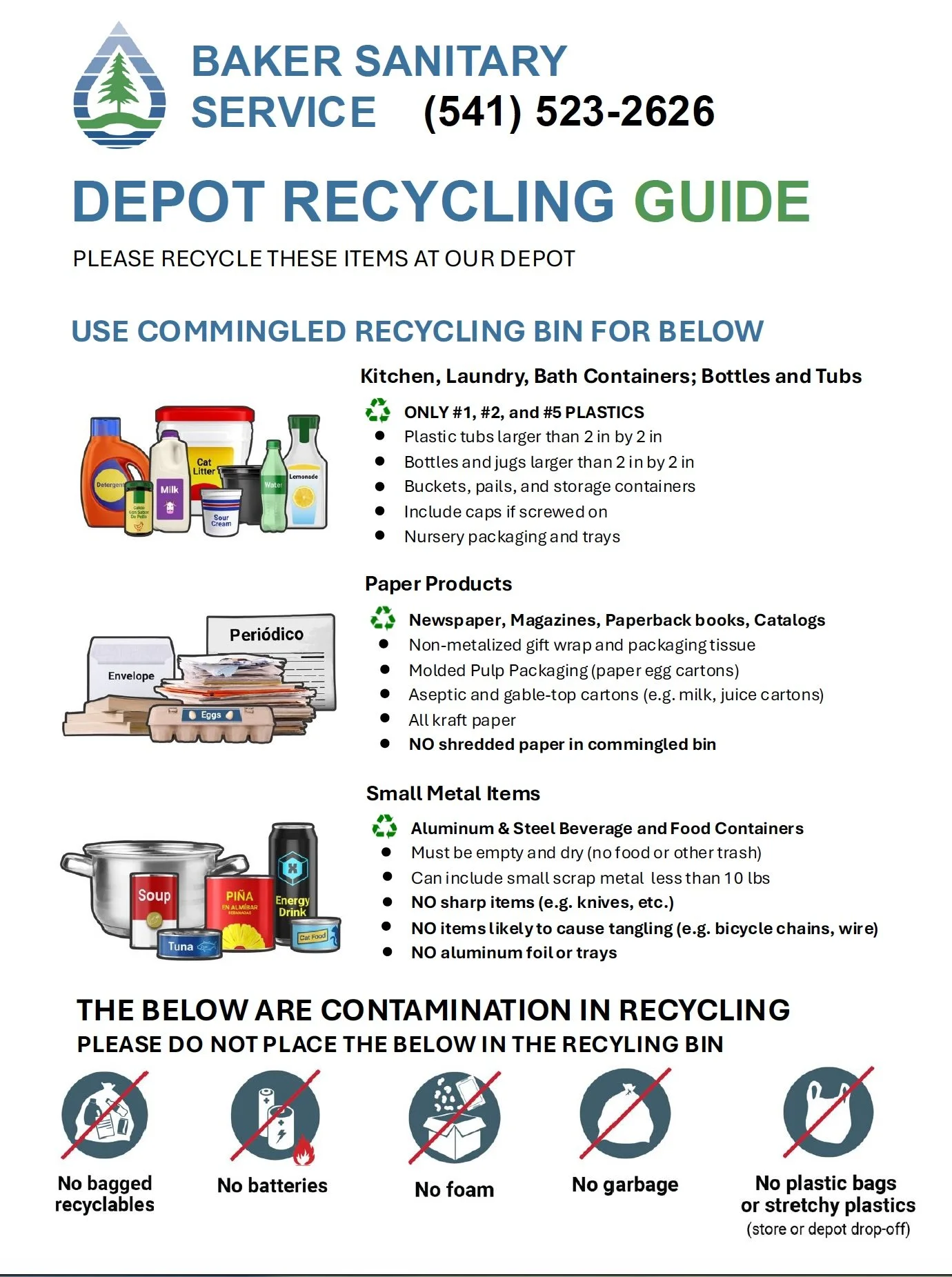 Baker Sanitary operates a recycling depot at 3110 Campbell St in Baker City and we provide commingled recycling for most materials, while still collecting materials such as glass, metal, and cardboard separately. We additionally collect most materials for recycling at a depot at our landfill at 39144 W Sutton Creek Rd as well. Please see the below depot recycling guide for more information regarding our depot recycling.