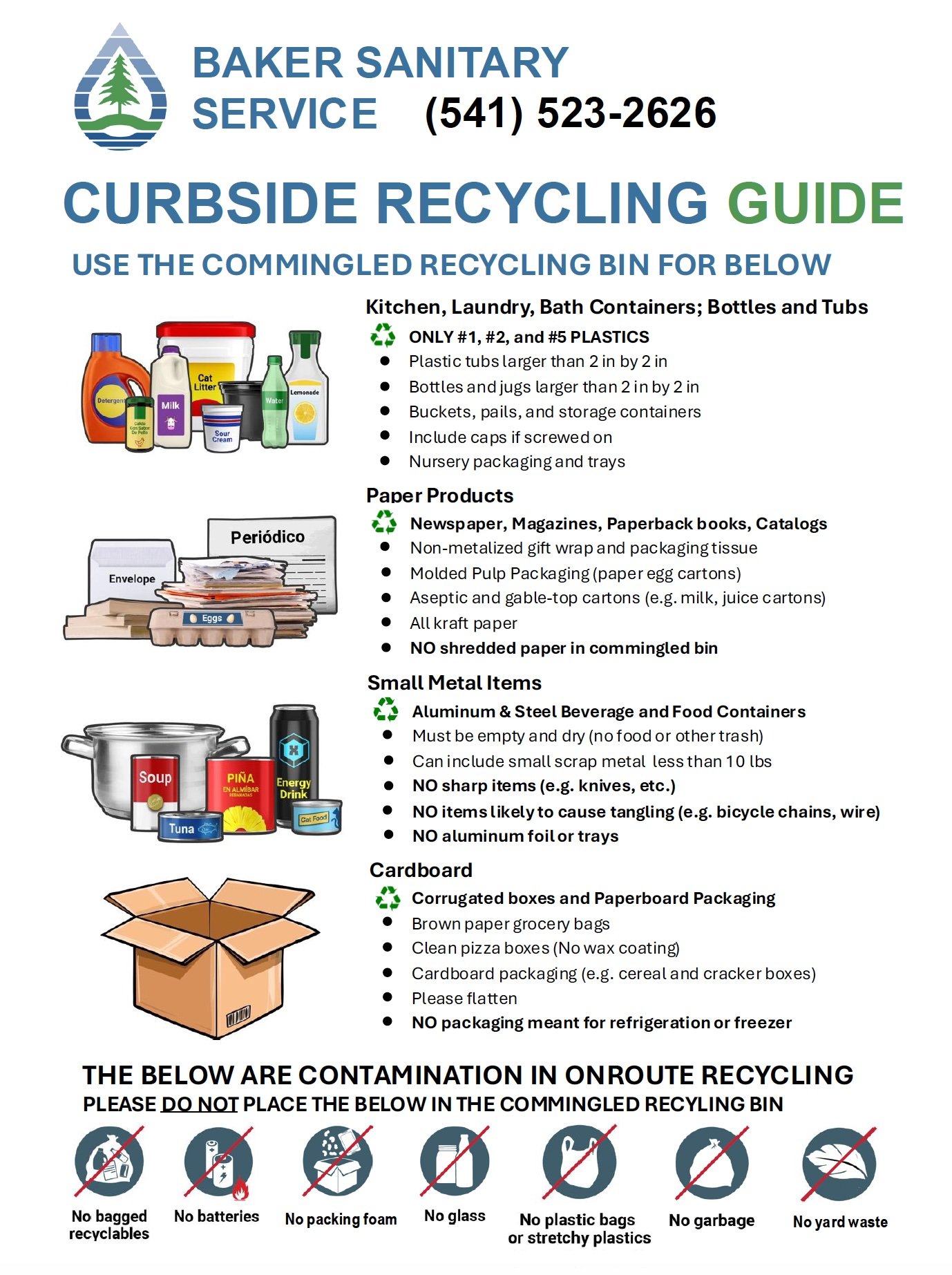 Starting April 2026, we now provide on-route commingled recycling collection in Baker City to residential and commercial customers. A 95 gallon recycling cart is provided to all garbage service customers and, for residential customers, is picked-up every other week on the same day as your garbage pickup. Commercial customers will be picked-up on Wednesdays every other week. Please see the below guide for curbside recycling information.